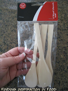 First up is an inspiration I got from a package of cookies I got from my mother in law one year. There’s something about tins and baskets I have a hard time re-gifting. I’ve held onto this tin for 2 years now I love the little ornaments attached to the top of the tin. So while I was at the 99 cent store I ran across this package of 4 wood utensils and almost started jumping up and down like I won the lottery because I knew exactly what I was going to do with them.
