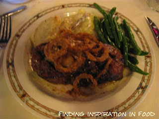 For the main course we had the Crab Stuffed Idaho Rainbow Trout with a Lemon Beurre Blanc and Rice Pilaf and NY Strip, Buttermilk Cornmeal Onion Rings and Pepper jack Au Gratin Potato Cake. The meal was very good except the fish dish it tasted like a frozen dinner and the only good part was the crab stuffing.