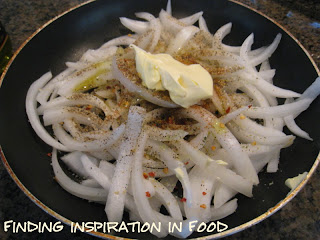 Meanwhile my hubby cooked up some onions on the stove top using butter, Tony’s, garlic salt, red pepper flakes, salt and pepper.
