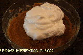 Using a rubber spatula, fold egg whites into chilled pumpkin mixture in two stages.