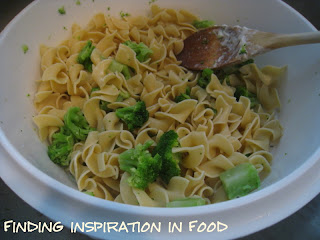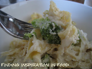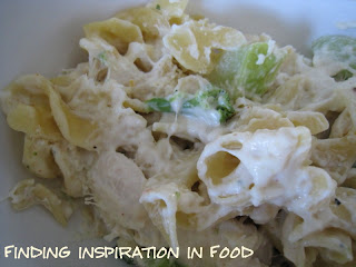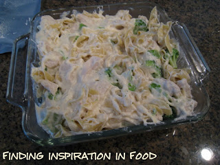Drain pasta and broccoli. Add chicken mixture; mix lightly. Spoon into 8 inch square baking dish, cover.