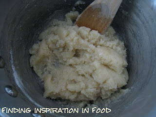 Remove the pan from the heat and add the flour. Using a wooden spoon, quickly stir the mixture until all the flour is fully incorporated and forms a thick dough.