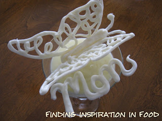 For dessert I made Mary’s Old Fashioned Lemon Pudding and decided to decorate it with some fancy chocolate. I put the pudding in martini glasses then garnished them with the white chocolate I piped out. There’s really no recipe for this you just want to melt your chocolate over a double boiler.