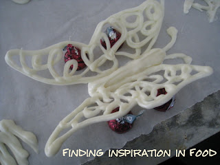 Once they hardened I piped a thick center for the body then propped up the wings using kisses.