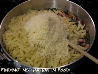 Drain the pasta, reserving about 1 cup of the pasta water. Add the pasta and Parmesan cheese to the skillet.