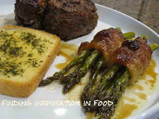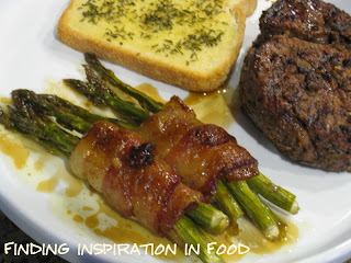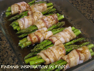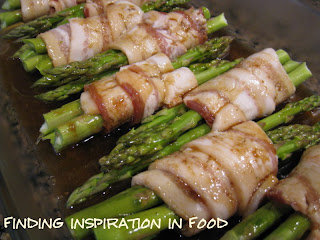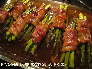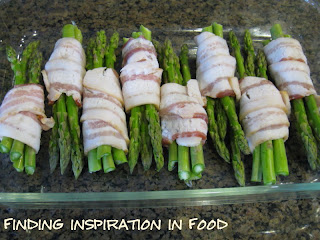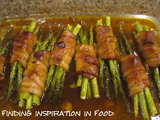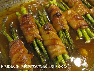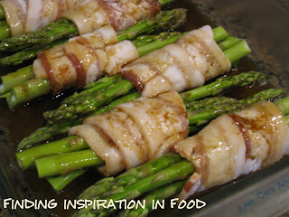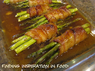 Preheat oven to 400 degrees F. Divide the asparagus into 12 bundles/ Carefully wrap 1 piece of bacon around each bundle, starting about 1/2 inch from the bottom of the tips. Secure the bacon-wrapped spears with a toothpick. (I didn’t do this, it did fine laying the flap side down.) Lay the bundles in a low-sided casserole dish.