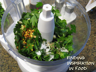 In the bowl of the food processor, blend together the parsley, garlic, vinegar, red pepper flakes, sugar 1 1/2 teaspoons salt, and 1/2 teaspoon black pepper, until smooth. With the machine running, gradually add the olive oil and process until incorporated.