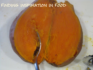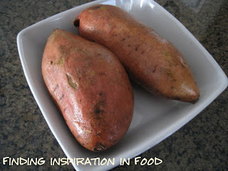 Cut sweet potatoes in half lengthwise; scoop out pulp and place in a medium glass bowl. Discard skin.