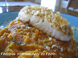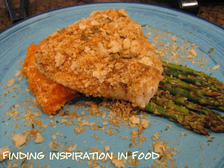 To plate divide up sweet potatoes and asparagus among plates. Top each serving of fish with a generous sprinkle of breadcrumbs, and serve.