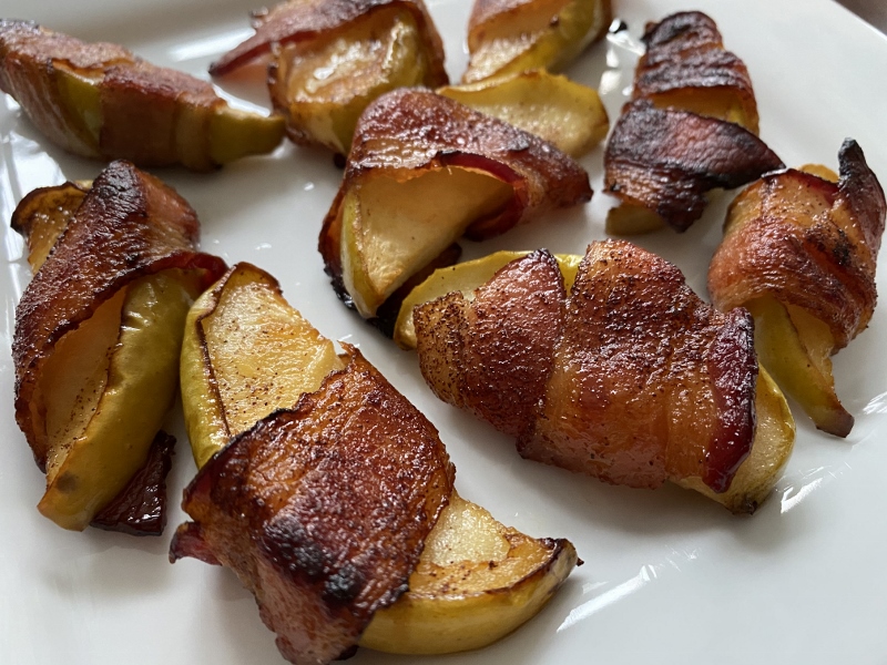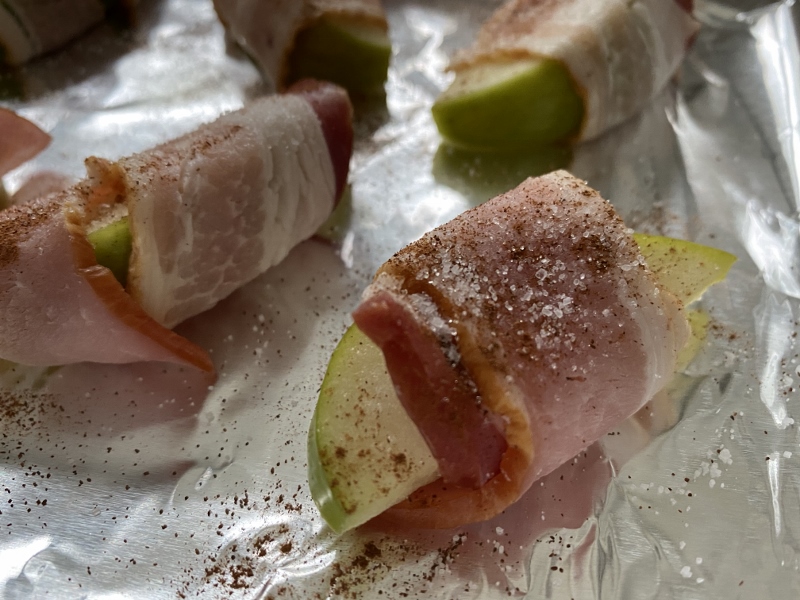 Preheat the oven to a low broil or 400 degrees. Wrap 1/2 piece of bacon around each apple slice until you run out of bacon.