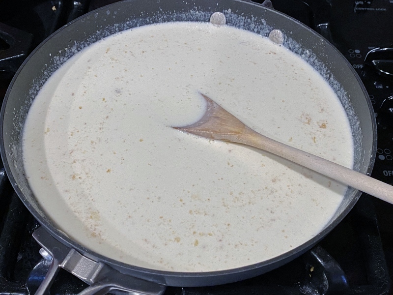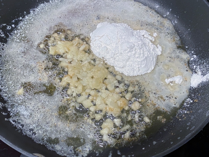 In a large skillet at medium heat, combine butter, flour, and minced garlic. Allow to cook for 3 minutes until smooth.