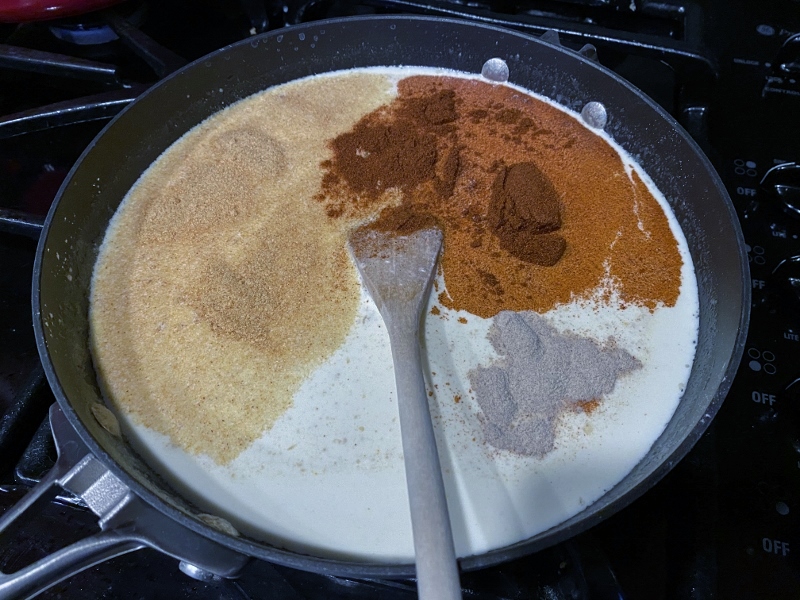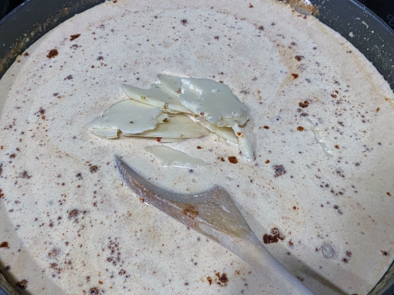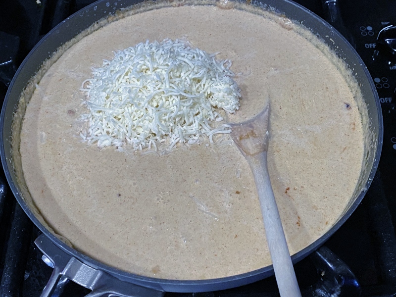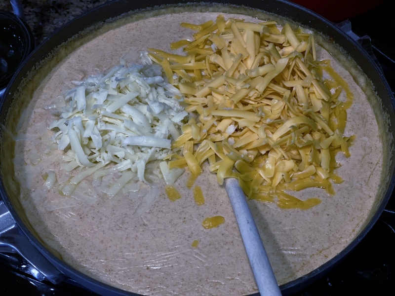 Add chicken broth, heavy whipping cream, garlic powder, white pepper, and paprika into skillet until well blended. Add sharp cheddar, New York white cheddar, Monterey Jack cheese, and pepper jack cheese in skillet and stir until smooth. Turn stove to simmer.