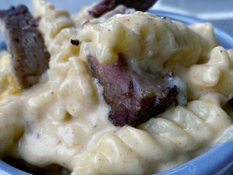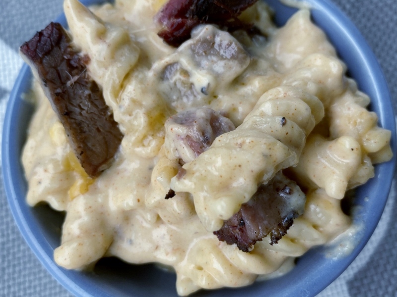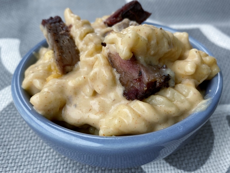 Add pasta, cheese sauce, mozzarella cubes and brisket (leave some to top off dish in next step) into large bowl and fold ingredients.