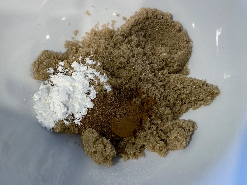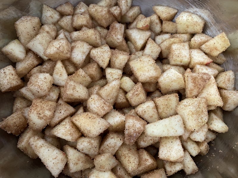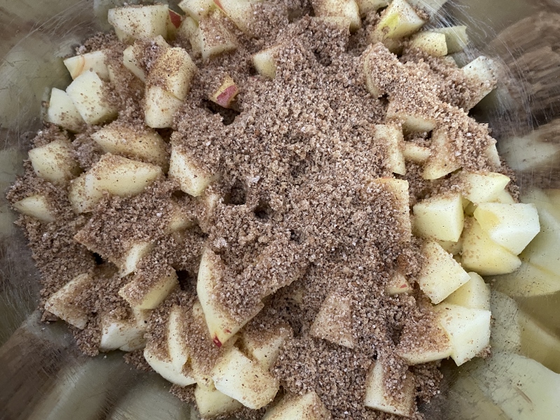Once all your apples are chopped and peeled, add the sugar, cornflour, cinnamon and mixed spice, and stir together