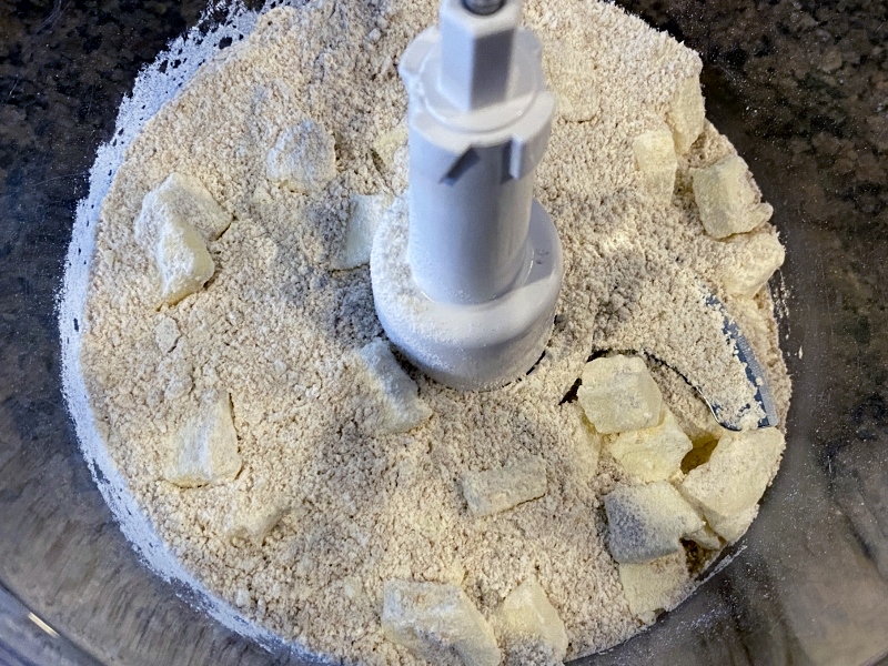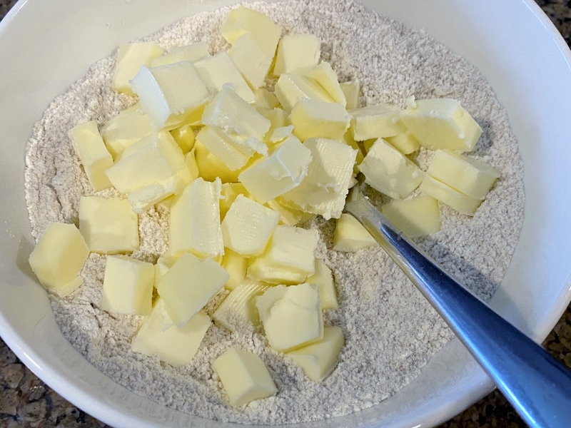 Add the butter to the bowl in chunks or cubes, then using your fingers, rub it into the flour and sugar until it resembles breadcrumbs. You can also do this in a food processor if you prefer